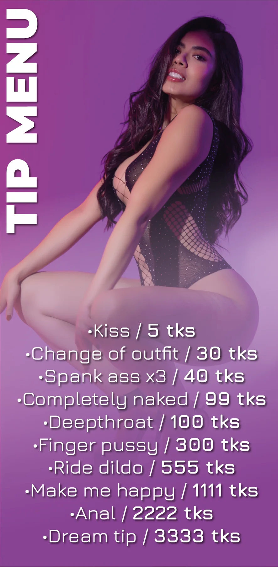Spanking, Erotisk dans, Kameltå, Finger, Dildo eller vibrator, Dirty talk, Fodfetich, Deepthroat, Sexlegetøj, Onani, Handjob, Orgasme, Ahegao, Dobbeltpenetration, Ydmygelse, Hardcore, Cowgirl, Brystsex, Blowjob